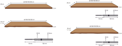 *Bei der Ausführung LIVE EDGE beträgt die Tiefe aufgrund der Naturkante min. 20 cm aber variiert aufgrund des natürlichen Baumwachstums.